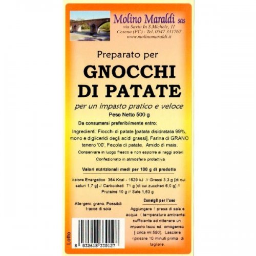 E un mix finissimo a base di fiocchi di patate disidratati, farina di grano tenero -00-, fecola di patate e amido di mais, con il quale potrai preparare facilmente i tipici gnocchi di patate in pochissimi minuti. La confezione da 500g è sufficiente per 4 porzioni. Disponibile in confezione da g 500, kg 5 e, su richiesta, kg 25. CONSIGLI DI UTILIZZO: Per la preparazione ti basterà aggiungere solo sale e acqua, un po alla volta, ed impastare il tutto fino a raggiungere la giusta consistenza (non deve appiccicare). Dopo avere fatto riposare limpasto ottenuto per 10 minuti, formerai dei rotolini di circa 1,5 cm di diametro che poi taglierai trasversalmente per ottenere gli gnocchi. Potrai cucinarli subito o congelarli per gustarli successivamente. Porta a ebollizione una pentola di acqua salata. Butta gli gnocchi e appena vengono a galla sono cotti. Ricorda: più li cuoci più induriscono! Condimento a piacere con ragù di carne, pesce o verdure oppure con formaggi. MODALITA DI CONSERVAZIONE: conservare in luogo fresco e asciutto, al riparo dai raggi solari.