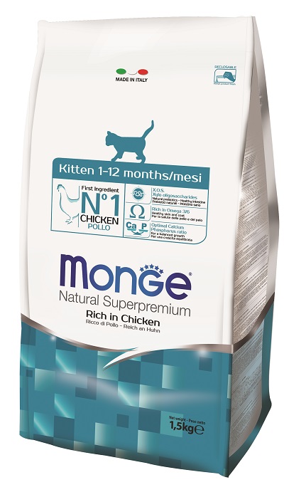 Kitten Ricco di Pollo Formato: 400 g – 1,5 kg I croccantini Monge Natural Superpremium Kitten sono un alimento completo per gattini da 1 a 12 mesi di vita. Garantiscono il benessere del gatto grazie alla presenza di elementi nutritivi di altissima qualità, frutto della ricerca Made in Italy. Il primo ingrediente è il pollo e sono arricchiti con xilo oligossacaridi (X.O.S.), prebiotici naturali che favoriscono la salute dell’intestino. Il rapporto ottimale tra calcio e fosforo assicura una crescita equilibrata e sono ricchi di Omega 3/6 per la salute della pelle e del pelo. Pollo (fresco 10%, disidratato 26%), riso, grasso animale (olio di pollo contenuto in grassi 99,6%, conservato con antiossidanti naturali), granturco, proteine animali idrolizzate, polpa di barbabietola, glutine di granturco, farina di uovo intero (ricco in proteine nobili), pesce (salmone disidratato), olio di pesce (olio di salmone), lievito di birra (fonte di M.O.S. e vitamina B12), fibra insolubile di pisello, taurina, X.O.S. (Xylo – oligosaccaridi 3 g/kg), idrolizzato di lievito (M.O.S.), yucca schidigera, rosa canina.