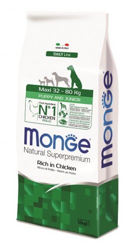 Maxi Puppy & Junior Ricco di Pollo Formato: 800 g - 3 kg - 12 kg Le crocchette Monge Natural Superpremium Maxi Puppy & Junior con Pollo sono un alimento completo per cuccioli di taglia grande. Garantiscono il benessere del cane grazie alla presenza di elementi nutritivi di altissima qualità, frutto della ricerca Made in Italy. Il primo ingrediente è il pollo e sono arricchite con xilo oligossacaridi (X.O.S.), prebiotici naturali che favoriscono la salute dell’intestino. Contengono estratto di carciofo, echinacea, origano e aglio che stimolano le difese immunitarie e proteggono il fegato. Condroitina, glucosamina, calcio e fosforo aiutano il corretto sviluppo delle ossa e delle articolazioni del cucciolo. Pollo (fresco 10%, disidratato 32%), riso, granturco, grasso animale (olio di pollo contenuto in grassi 99,6%, conservato con antiossidanti naturali), polpa di barbabietola, lievito di birra (fonte di M.O.S. e vitamina B12), glutine di granturco, proteine animali idrolizzate, avena (ricca di fibre nobili), farina di uovo intero (ricco in proteine nobili), pesce (salmone disidratato), olio di pesce (olio di salmone), X.O.S. (Xylo – oligosaccaridi 3 g/kg), idrolizzato di lievito (M.O.S.), yucca schidigera, spirulina, cartilagine idrolizzata (fonte di condroitina solfato), crostacei idrolizzati (fonte di glucosamina), metil sulfonil metano, radice di echinacea, origano, aglio essiccato in polvere.