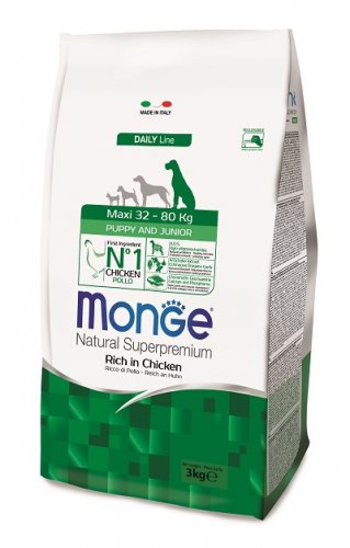Maxi Puppy & Junior Ricco di Pollo Formato: 800 g - 3 kg - 12 kg Le crocchette Monge Natural Superpremium Maxi Puppy & Junior con Pollo sono un alimento completo per cuccioli di taglia grande. Garantiscono il benessere del cane grazie alla presenza di elementi nutritivi di altissima qualità, frutto della ricerca Made in Italy. Il primo ingrediente è il pollo e sono arricchite con xilo oligossacaridi (X.O.S.), prebiotici naturali che favoriscono la salute dell’intestino. Contengono estratto di carciofo, echinacea, origano e aglio che stimolano le difese immunitarie e proteggono il fegato. Condroitina, glucosamina, calcio e fosforo aiutano il corretto sviluppo delle ossa e delle articolazioni del cucciolo. Pollo (fresco 10%, disidratato 32%), riso, granturco, grasso animale (olio di pollo contenuto in grassi 99,6%, conservato con antiossidanti naturali), polpa di barbabietola, lievito di birra (fonte di M.O.S. e vitamina B12), glutine di granturco, proteine animali idrolizzate, avena (ricca di fibre nobili), farina di uovo intero (ricco in proteine nobili), pesce (salmone disidratato), olio di pesce (olio di salmone), X.O.S. (Xylo – oligosaccaridi 3 g/kg), idrolizzato di lievito (M.O.S.), yucca schidigera, spirulina, cartilagine idrolizzata (fonte di condroitina solfato), crostacei idrolizzati (fonte di glucosamina), metil sulfonil metano, radice di echinacea, origano, aglio essiccato in polvere.