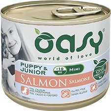 ONE PROTEIN - PUPPY & JUNIOR SALMONE MINI PATÉ MONOPROTEICO. ALIMENTO COMPLETO PER CUCCIOLI DI TAGLIA PICCOLA. Composizione: Salmone 94%, patate 4,1%, oli e grassi vegetali, fruttoligosaccaridi 0,1%. Componenti analitici: Proteina Grezza 9%, Oli e Grassi Grezzi 7%, Ceneri Grezze 3%, Fibra Grezza 0,5%, Calcio 0,18%, Fosforo 0,18%, Umidità 79%. Additivi per Kg: Additivi Nutrizionali: Vitamina A 2670 UI, Vitamina D3 290,5 UI, Solfato di Zinco Monoidrato 42,77 mg, Carbonato Ferroso 13,5mg, Solfato Rameico Pentaidrato 6,42 mg, Ioduro di Potassio 0,49 mg, Solfato Manganoso Monoidrato 3,51 mg, Selenito di Sodio 0,18 mg. Additivi Tecnologici: Gomma Cassia 1062,5 mg. SUGGERIMENTI D’USO: Oasy è pronto per l’uso e va servito a temperatura ambiente. Lasciare sempre a disposizione del cucciolo acqua fresca. RAZIONE GIORNALIERA CONSIGLIATA: GRAMMI/GIORNO Peso da Adulto 2 mesi 4 mesi 6/8 mesi 10/12 mesi Toy Breeds 1-5 kg 190 g 280 g 340 gr 340 g Small Breeds 6-10 kg 350 g 570 g 720 g 660 g