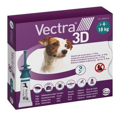 VECTRA 3D 3 PIP 4-10 KG CANE Categoria farmacoterapeutica Ectoparassicidi per uso topico. Principi attivi Dinotefuran, piriproxifene, permetrina. Eccipienti N-ottil-2-pirrolidone, N-metilpirrolidone. Indicazioni Pulci: trattamento e prevenzione di infestazione da pulci (Ctenocephalides felis e Ctenocephalides canis). Il trattamento previene linfestazione da pulci per un mese. Previene anche la moltiplicazione di pulci per due mesi dopo lapplicazione inibendo lapertura delle uova (attivita ovicida) ed inibendo la comparsa di adulti da uova deposte da pulci adulte (attivita larvicida). Il medicinale veterinario puo essere usato come parte di una strategia di trattamento per la dermatite da allergia da pulci (FAD). Zecche: il medicinale veterinario ha persistente efficacia acaricida ed azione repellente contro infestazioni da zecche (Rhipicephalus sanguineus e Ixodes ricinus per un mese, e Dermacentor reticulatus fino a tre settimane). Se sono presenti delle zecche quando e applicato il medicinale veterinario, queste possono non essere uccise tutte entro le prime 48 ore ma possono morire entro una settimana. Per rimuovere le zecche e consigliato limpiego di un apposito dispositivo per la rimozione delle zecche. Flebotomi, zanzare e mosche: il trattamento fornisce persistente attivita repellente (anti-feeding). Previene le punture di flebotomi (Phlebotomus perniciosus), zanzare (Culex pipiens, Aedes aegypti) e mosche (Stomoxys calcitrans) per un mese dallapplicazione. Il trattamento fornisce anche persistente attivita insetticida per un mese contro zanzare (Aedes aegypti) e mosche (Stomoxys calcitrans). Controindicazioni/eff.secondar Non usare in caso di ipersensibilita ad uno o piu principi attivi o ad uno degli eccipienti. Non usare sui gatti. A causa della loro particolare fisiologia ed incapacita a metabolizzare permetrina, questo medicinale veterinario non deve essere impiegato sui gatti. Se applicato su un gatto, o ingerito da un gatto che si e strofinato attivamente su un cane recentemente trattato, questo medicinale veterinario puo determinare reazioni nocive gravi. Uso/via di somministrazione Topica. Posologia La dose minima raccomandata e 6,4 mg dinotefuran/kg peso corporeo, 0,6 mg piriproxifene/kg peso corporeo e 46,6 mg permetrina/kg peso corporeo, equivalenti a 0,12 ml del medicinale veterinario per kg di peso corporeo. Utilizzare la confezione appropriata in base al peso corporeo dellanimale. Prestare attenzione ad applicare il medicinale veterinario solo su cute intatta. Evitare lapplicazione superficiale al manto del cane. Schema di trattamento: a seguito di singola applicazione, il medicinale veterinario preverra linfestazione per un mese. Il trattamento puo essere ripetuto una volta al mese. Conservazione Questo medicinale veterinario non richiede alcuna condizione particolare di conservazione.