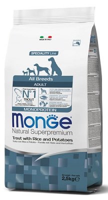 MONGE ALL BREEDS ADULT TROTA KG 2,5 Monge Natural Superpremium All breeds Adult Monoprotein* Trota con riso e patate è un alimento completo per cani adulti di tutte le taglie. Specificamente sviluppato pensando al benessere del tuo cane, grazie alla presenza di sostanze nutritive di qualità frutto della ricerca Made in Italy. Prodotto formulato con un’unica fonte proteica animale*, la trota è il primo ingrediente, arricchita con prebiotici di ultima generazione xilo-oligosaccaridi (XOS) per il supporto del benessere intestinale. La formulazione contiene inoltre ingredienti ed estratti vegetali, come la radice di echinacea, origano, aglio e estratto di carciofo, e glucosamina e solfato di condroitina per il supporto delle articolazioni e delle ossa. Senza coloranti e conservanti artificiali aggiunti. COMPOSIZIONE: Trota disidratata (27%), riso (15%), granturco, grasso animale (olio di pollo purificato al 99,5%), glutine di granturco, polpa di barbabietola essiccata, patate (4%), proteine animali idrolizzate (fegato), lievito di birra, sostanze minerali, olio di pesce (olio di salmone purificato al 99,5%), prodotti del lievito (mannano oligo saccaridi MOS 1%), xilo-oligosaccaride (XOS 0,3%), yucca schidigera (0,3%), farina di alghe (spirulina – Arthrospira platensis 0,3%), prodotti ottenuti dalla trasformazione di vegetali (radice di Echinacea purpurea 0,2%, Origanum Vulgare 0,1%), aglio essiccato (0,2%), glucosamina (0,057%), solfato di condroitina (0,04%).