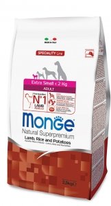 Extra Small Adult Agnello, Riso e Patate Formato: 800 g - 2,5 kg Le crocchette Monge Natural Superpremium Speciality Line Extra Small Adult con Agnello, Riso e Patate sono un alimento completo per cani adulti di taglia molto piccola. Garantiscono il benessere del cane grazie alla presenza di elementi nutritivi di altissima qualità, frutto della ricerca Made in Italy. Il primo ingrediente è l’agnello e sono arricchite con xilo oligossacaridi (X.O.S.), prebiotici naturali che favoriscono la salute dell’intestino. Contengono estratto di carciofo, echinacea, origano e aglio che stimolano le difese immunitarie e proteggono il fegato. Le dimensioni della crocchetta sono adatte a denti e mandibole. Agnello (fresco 10%, disidratato 30%), riso, granturco, grasso animale (olio di pollo contenuto in grassi 99,5%, conservato con antiossidanti naturali), polpa di barbabietola, concentrato proteico di patate, lievito di birra (fonte di M.O.S. e vitamina B12), glutine di granturco, proteine animali idrolizzate, pesce (salmone disidratato), olio di pesce (olio di salmone), cartilagine idrolizzata (fonte di condroitina solfato), crostacei idrolizzati (fonte di glucosamina), metil sulfonil metano, X.O.S. (Xylo – oligosaccaridi 3 g/kg), idrolizzato di lievito (M.O.S.), yucca schidigera, spirulina, radice di echinacea, origano, aglio essiccato in polvere.