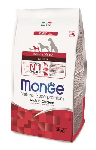 Mini Senior Ricco di Pollo Formato: 3 kg Le crocchette Monge Natural Superpremium Mini Senior con Pollo sono un alimento completo per cani di piccola taglia in età avanzata. Garantiscono il benessere del cane grazie alla presenza di elementi nutritivi di altissima qualità, frutto della ricerca Made in Italy. Il primo ingrediente è il pollo e sono arricchite con xilo oligossacaridi (X.O.S.), prebiotici naturali che favoriscono la salute dell’intestino. Contengono condroitina, glucosamina, calcio e fosforo che aiutano il corretto sviluppo delle ossa e delle articolazioni e L-Carnitina che rafforza il sistema circolatorio e garantisce un peso ottimale. Pollo (fresco 10%, disidratato 30%), riso, avena (fonte di fibre nobili), polpa di barbabietola, grasso animale (olio di pollo contenuto in grassi 99,5%, conservato con antiossidanti naturali), granturco, lievito di birra (fonte di M.O.S. e vitamina B12), proteine animali idrolizzate, concentrato proteico di patate, farina di uovo intero (ricco in proteine nobili), pesce (salmone disidratato), olio di pesce (olio di salmone), cartilagine idrolizzata (fonte di condroitina solfato), crostacei idrolizzati (fonte di glucosamina), metil sulfonil metano, X.O.S. (Xylo – oligosaccaridi 3 g/kg), idrolizzato di lievito (M.O.S.), yucca schidigera, spirulina, gambo d’ananas.