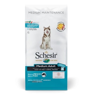 SCHESIR MEDIUM ADULT MAINTENANCE PESCE KG 12 La gamma di crocchette Schesir Dry Line for Dogs si arricchisce nuove referenze per cani di taglia media (10-30 kg). E formulata con ingredienti naturali, più vitamine e minerali, per rispondere alle esigenze nutrizionali dei cani di taglia media di qualsiasi razza. Tutte le varietà proposte sono prive di coloranti e di conservanti aggiunti e contengono fonti proteiche ad alta digeribilità. Easy digestion, questa linea di alimenti si caratterizza per la facilità ad essere digerita divenendo quindi un alimneto ideale per cani di qualsiasi dimensione e con esigenze diverse. L’elevata digeribilità, in sinergia con un corretto bilanciamento dei diversi nutrienti, aiuta il cane a mantenere il giusto peso, ossa forti ed un tono muscolare ottimale. Benefici specifici di Schesir Medium Maintenance Pesce: SKIN CARE & OMEGA 3/6: Il lievito di birra, insieme agli Omega 3 naturalmente contenuti nel pesce e agli Omega 6, innalzano le difese immunitarie e promuovono la crescita di pelo forte e cute sana gli acidi grassi essenziali aiutano, infine, l’organismo a combattere i radicali liberi, stimolandolo a restare sempre giovane e attivo. PREBIOTIC ACTION: FOS (fruttoligosaccaridi) e lievito di birra (il quale apporta vit. Gruppo B), ingredienti ad azione prebiotica, favoriscono un’efficace assimilazione dei nutrienti e contribuiscono al controllo dei cattivi odori. Mangime completo per animali da compagnia. Composizione Farine di pesce (10% tonno, 8% aringa), 18% riso, granoturco, 5% proteine animali trasformate, grasso animale suino purificato, polpa di barbabietola essiccata, 1% fruttoligosaccaridi (FOS), 1% polpa di cicoria essiccata, 1% lieviti essiccati, fosfato bicalcico, cloruro di potassio, cloruro di sodio, yucca schidigera.