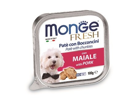 Paté e Bocconcini con Maiale Formato: 100 g Delizioso paté con un cuore di prelibati bocconcini con maiale fresco selezionato per offrire ai nostri amici il benessere quotidiano di cui hanno bisogno e per essere sempre in forma. Senza coloranti, conservanti e con un basso tenore di zuccheri, è ideale per cani di piccola taglia e come premio per i cani più grandi. Carni fresche 80% (di cui maiale minimo 10%), sali minerali, vitamine.