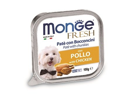 Paté e Bocconcini con Pollo Formato: 100 g Delizioso paté con un cuore di prelibati bocconcini con pollo fresco selezionato per offrire ai nostri amici il benessere quotidiano di cui hanno bisogno e per essere sempre in forma. Senza coloranti, conservanti e con un basso tenore di zuccheri, è ideale per cani di piccola taglia e come premio per i cani più grandi. Carni fresche 80% (di cui pollo minimo 10%), sali minerali, vitamine.