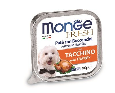 Paté e Bocconcini con Tacchino Formato: 100 g Delizioso paté con un cuore di prelibati bocconcini con tacchino fresco selezionato per offrire ai nostri amici il benessere quotidiano di cui hanno bisogno e per essere sempre in forma. Senza coloranti, conservanti e con un basso tenore di zuccheri, è ideale per cani di piccola taglia e come premio per i cani più grandi. Carni fresche 80% (di cui tacchino minimo 10%), sali minerali, vitamine.