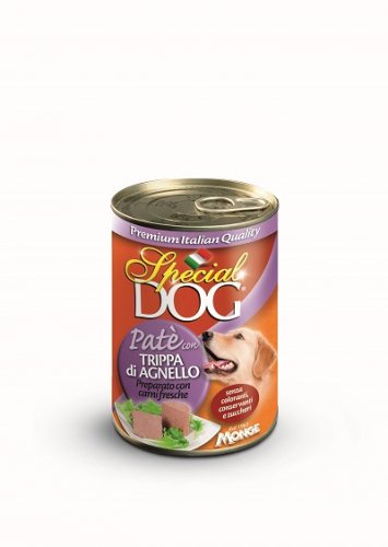 Paté con Trippa di Agnello Formato: 400 g Paté premium preparato con trippa di agnello, adatto all’alimentazione quotidiana di cani di tutte le razze, senza coloranti, conservanti e zuccheri aggiunti. Carni e derivati 80% (di cui trippa di agnello 26%), sali minerali, vitamine.