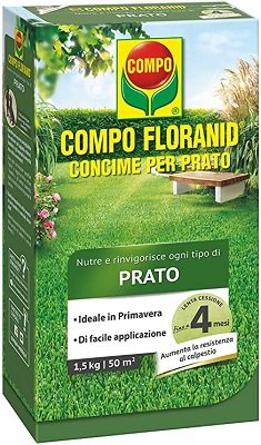 COMPO Concime per Prato Per nutrire e rinvigorire ogni tipo di prato Per far crescere il prato del vostro giardino in modo costante e bilanciato, questo concime granulare COMPO fornisce una nutrizione prolungata fino a 4 mesi grazie all’azoto che viene rilasciato gradualmente. Il contenuto in magnesio, ferro e microelementi aumenta la resistenza del tappeto erboso e consente una colorazione verde intensa. Si consiglia di usare in primavera e dopo l’estate - 1-2 giorni dopo il taglio - distribuendolo sul prato asciutto e innaffiando molto subito dopo.