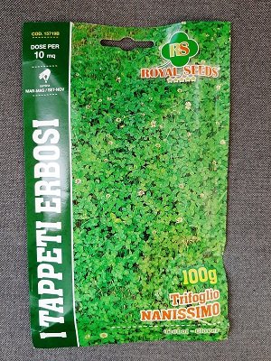 TRIFOGLIO NANISSIMO GR 100 Selezione molto rustica a grande accrescimento che si caratterizza per lo sviluppo in altezza molto contenuto. La foglia è più piccola rispetto al Trifoglio Repens Nano ed è ugualmente consigliato per terreni sciolti e freschi. Manutenzione ridotta.