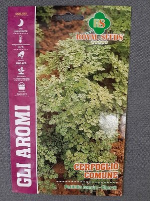 BUSTA ORTO CERFOGLIO COMUNE RS Pianta erbacea annuale a portamento cespuglioso, ha proprietà rinfrescanti, diuretiche, antisettiche, viene usata principalmente in cucina in insalata o come condimento. Si consiglia la semina diretta a file, nei mesi di Marzo-Aprile per raccolta Agosto-Ottobre ad una distanza di cm 20 x 5.
