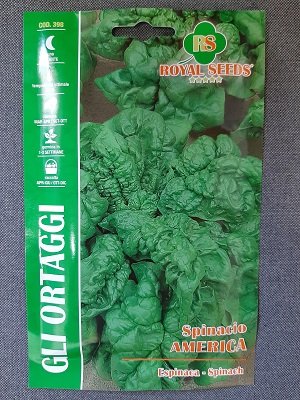 SPINACIO AMERICA MAXI RS Varietà di spinacio con buona resistenza a montare a seme, molto riproduttivo, particolarmente indicato per rusticità e facilità di accrescimento per hobbisti esigenti. Le folgie sono larghe, carnose, di un bel colore verde intenso. Varietà da non impiegarsi nei periodi estivi. La semina viene effettuata nei periodi di marzo/aprile e settembre/ottobre a foile distanti tra loro cm 30 e cm 5 sulle file.