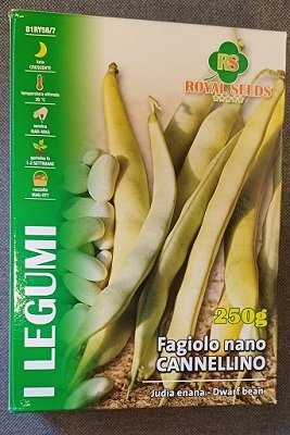 FAGIOLINO NANO CANNELLINO GR 250 Eccellente varietà per orto famigliare, capace di altissime produzioni. Si semina da Marzo a fine Maggio, a file distanti cm 50/60, ponendo un seme a cm 4/5. La raccolta dei baccelli inizia dopo 80/85 gg. dalla semina e si protrae per lungo tempo.