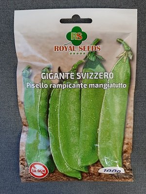 PISELLO RAMPICANTE MANGIATUTTO GIGANTE SVIZZERO GR 100 VARIETA RAMPICANTE. Pianta vigorosa che produce baccelli verde chiaro, appiattiti e leggermente ricurvi, lunghi 10-11 cm e che contengono 6-8 ovuli. La coltivazione è la stessa dei piselli tradizionali quindi si semina preferibilmente in autunno/inverno al centro-sud, mentre da fine inverno e per tutta la primavera al nord. Le buche disteranno 4 cm luna dallaltra, mentre le file saranno a 80 cm tra di loro. Il baccello non presenta fibrosità e si consuma interamente senza sgusciarlo.