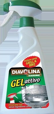DIAVOLINA PULITORE GRILL ML.500 Gel Attivo Diavolina è un pulitore specifico per le griglie, il braciere e tutte le parti del barbecue. Dettagli tecnici Gel Attivo è un’emulsione in gel, in grado di rimuovere lo sporco più difficile come i depositi di unto. La sua particolarità è che non contiene ingredienti corrosivi o aggressivi. Sulle zone incrostate spruzzare e lasciare agire per qualche minuto. Poi rimuovere, se occorre utilizzando un abrasivo specifico come Diavolina Fibra Grill, quindi risciacquare. Pulisce e sgrassa a fondo senza sostanze aggressive. Efficace e sicuro per il barbecue.