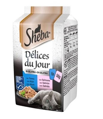 SHEBA DDJ TONNO SALMONE IN GELATINA 6X50 GR Sheba Delice Du Jour è un delizioso alimento umido per gatti adulti. Si tratta di delicati bocconcini tagliati in maniera molto fine conservati in morbida gelatina dal gusto di tonno e salmone. Gli ingredienti di prima qualità daranno al tuo gatto unesperienza di gusto senza fine. Il prodotto è disponibile in 6 pratiche bustine monodose salva freschezza da 85 g. Sheba Delice Du Jour Gelatina al gusto Tonno e Salmone è stato preparato senza laggiunta di coloranti e conservanti artificiali. Ingredienti: Con Tonno: carni e derivati (38%), pesci e sottoprodotti dei pesci (di cui tonno 4%), sostanze minerali, zuccheri. Con salmone: carni e derivati (38%), pesci e sottoprodotti dei pesci (di cui salmone 4%), sostanze minerali, zuccheri. Componenti Analitici: proteina grezza: 7.7 oli e grassi grezzi: 4.8 ceneri grezze: 1.7 fibra grezza: 0.30 umidità: 85.0. Additivi: Integrazioni per kg: Additivi nutrizionali: Taurina: 537 mg, Rame (Solfato di rame(II) pentaidrato): 1.2 mg, Iodio (iodato dicalcio, anidro): 0.32 mg, Ferro (solfato di ferro (II) monoidrato): 15.8 mg, Manganese (solfato manganoso, monoidrato): 3.2 mg, Zinco (solfato di zinco, monoidrato): 15.0 mg.