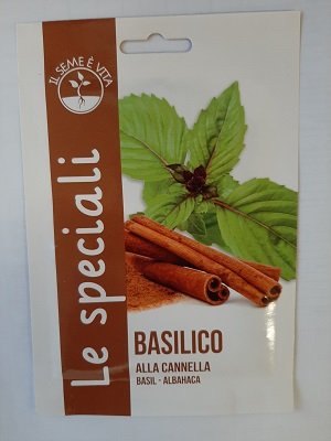 BUSTA SPECIALE BASILICO ALLA CANNELLA Varietà medio precoce. Pianta rustica, a portamento eretto che produce numerose foglie di colore verde con sfumature viola ed intensamente profumate alla cannella. Fiori di colore rosso-violaceo. Indicata anche per coltivazione in vaso.