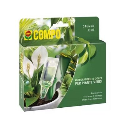 COMPO GOCCE PER PIANTE VERDI PZ 5 COMPO Nutrimento in Gocce per Piante Verdi Speciale formulazione che integra sali minerali in soluzione per la corretta nutrizione di tutte le piante verdi. Semplice e sicuro da usare: pronto alluso per evitare errori di dosaggio e il contatto con le mani Fino ad 1 mese di efficacia grazie al rilascio graduale dei sali minerali Descrizione del prodotto Speciale formulazione che integra sali minerali in soluzione per la corretta nutrizione di tutte le piante verdi. Semplice e sicuro da usare: pronto alluso per evitare errori di dosaggio e il contatto con le mani. Fino ad un mese di efficacia grazie al rilascio graduale dei sali minerali. La fiala si esaurisce in 15 giorni ma leffetto permane, a seconda delle condizioni del terriccio, fino ad 1 mese. Per unazione efficace ripetere lapplicazione tutto lanno ogni 1-2 mesi sostituendo a fiala esaurita. Impiego Raccomandazioni per luso 1) Tagliare lestremità della fiala lungo la linea tratteggiata. 2) Inserire la fiala obliquamente nel vaso ad una profondità di 2-3 cm, ad una distanza di 5-6 cm dala base della pianta e annaffiare. La fiala non sostituisce le normali operazioni di annaffiatura. Ogni fiala ha una durata media di 15 giorni, in base alle condizioni del terriccio, ma leffetto permane fino ad 1 mese. Per unazione efficace ripetere lapplicazione tutto lanno e sostituire la fiala ogni 1-2 mesi.