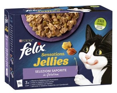 FELIX SENSATIONS JELLIES SELEZIONI SAPORITE 12X85 GR FELIX® Sensations® Jellies è una gamma di ricette irresistibili per il tuo gatto, preparate con ingredienti di qualità, dall’aspetto, dal profumo e ovviamente dal gusto delizioso. Ogni ricetta FELIX Sensations Jellies contiene teneri bocconcini avvolti in differenti gelatine insaporite per un gusto eccezionale ed un profumo invitante. Sono anche una fonte di acidi grassi essenziali Omega 6 e contengono la giusta combinazione di vitamine che aiuta il tuo gatto a rimanere pieno di vitalità e sempre pronto a nuove marachelle! Sono una sana bontà e soddisfano al 100% il fabbisogno giornaliero del tuo gatto, se servite secondo la razione giornaliera indicata sulla confezione. E non è tutto! FELIX Sensations Jellies è disponibile in unampia gamma di gustose ricette in succulente gelatine! Se sei così fortunato da avere un gatto sensazionale come FELIX, delizia i suoi sensi con FELIX Sensations Jellies! FELIX - semplicemente irresistibile! Composizione: MANZO IN GELATINA E POMODORO: Carni e derivati (di cui manzo 4%), Estratti di proteine vegetali, Ortaggi (2,7% concentrato di pomodoro, equivalente a 4% di pomodoro nella gelatina), Pesci e Sottoprodotti dei pesci, Sostanze Minerali, Zuccheri. POLLO IN GELATINA E CAROTE: Carni e derivati (di cui pollo 4%), Estratti di proteine vegetali, Ortaggi (2,7% concentrato di carote, equivalente a 4% di carote nella gelatina), Pesci e sottoprodotti dei pesci, Sostanze minerali, Zuccheri. SALMONE IN GELATINA E GAMBERETTI: Carni e derivati, Estratti di proteine vegetali, Pesci e Sottoprodotti dei pesci (salmone 4%), Molluschi e Crostacei (gamberetti 1%), Sostanze Minerali, Zuccheri. TROTA IN GELATINA E SPINACI: Carni e derivati, Estratti di proteine vegetali, Pesci e sottoprodotti dei Pesci (trota 4%), Sostanze minerali, Ortaggi (0,3% spinaci disidratati, equivalente a 4% di spinaci nella gelatina), Zuccheri.