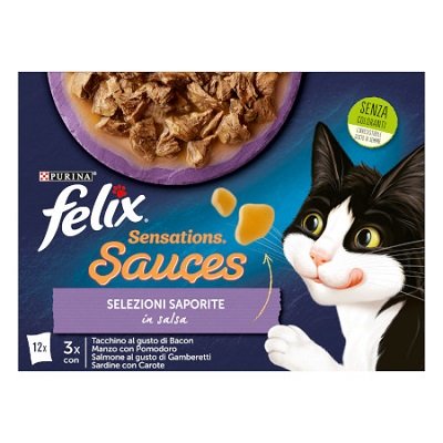 FELIX SENSATIONS SAUCES SELEZIONI SAPORITE 12X85 GR Multipack al gusto Tacchino al gusto Bacon, Manzo con Pomorodo, Salmone al gusto di Gamberetti, Sardine con Carote. Felix Sensations Sauces è una gamma di ricette per il tuo gatto, preparate con ingredienti di qualità, dall’aspetto, dal profumo e ovviamente dal gusto delizioso. Ogni ricetta Felix Sensations Sauces contiene teneri bocconcini avvolti in squisite salse insaporite ogni volta diverse per una succulenta sorpresa. Sono anche una fonte di acidi grassi essenziali Omega 6 e contengono la giusta combinazione di vitamine che aiuta il tuo gatto a rimanere pieno di energia e sempre pronto a nuove marachelle! Sono una sana bontà e soddisfano al 100% il fabbisogno giornaliero del tuo gatto, se servite secondo la razione giornaliera indicata sulla confezione. E non è tutto! Felix Sensations Sauces è disponibile in unampia gamma di gustose ricette in succulente salse! Se sei così fortunato da avere un gatto sensazionale come FELIX, delizia i suoi sensi con Felix Sensations Sauces! Mangime completo per animali da compagnia. Composizione Tacchino al gusto di bacon: Carni e derivati (16% di cui tacchino 4%), Estratti di proteine vegetali, Pesci e sottoprodotti dei pesci, Sostanze minerali, Zuccheri. Boconcini: 46% Carni e derivati. Manzo con pomodoro: Carni e derivati (16%, di cui manzo 4%), Estratti di proteine vegetali, Pesci e sottoprodotti dei pesci, Ortaggi (0,9% pomodoro disidratato equivalente a 8,1% pomodoro nella salsa), Sostanze minerali, Zuccheri. Bocconcini: 46% Carni e derivati. Salmone al gusto di gamberetti: Carni e derivati (14%), Estratti di proteine vegetali, Pesci e sottoprodotti dei pesci (salmone 4%), Sostanze minerali, Zuccheri. Bocconcini: 42% Carni e derivati. Sardine con carote: Carni e derivati (14%), Estratti di proteine vegetali, Pesci e sottoprodotti dei pesci (sardine 4%), Sostanze minerali, Ortaggi (0,7% carote disidratate, equivalente a 6,3% carote nella salsa), Zuccheri. Bocconcini: 42% Carne e derivati. Additivi UI/kg: Vit A: 655 Vit D3: 100 Vit E: 15 mg/kg: Solfato di ferro (II) monoidrato: (Fe: 7,6) Iodato di calcio anidro: (I: 0,19) Solfato di rame (II) pentaidrato: (Cu: 0,66) Solfato manganoso monoidrato: (Mn: 1,5) Solfato di zinco monoidrato: (Zn: 13) Taurina: 413. Aromatizzanti. Componenti analitici Umidità 80%, Proteina 12,5%, Grassi grezzi 2,5%, Ceneri grezze 2,5%, Fibra grezza 0,05%, Acidi grassi omega 6 0,4%.