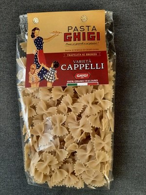 GHIGI FARFALLE CAPPELLI GR 400 TRAFILATA AL BRONZO 100% GRANO ITALIANO INGREDIENTI: SEMOLA DI GRANO DURO. PUò CONTENERE TRACCE DI SOIA E SENAPE. TEMPO DI COTTURA 10 MINUTI