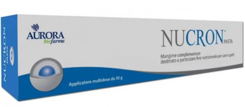 NUCRON PASTA 30 GR Descrizione Nucron Pasta Mangime Complementare Per Cani E Gatti 30g Nucron Pasta Mangime complementare destinato a particolare fine nutrizionale per cani e gatti. Utile per la riduzione dei disturbi acuti dellassorbimento intestinale. Da utilizzare durante le fasi di diarrea acuta e i periodi di convalescenza successivi. Si raccomanda di chiedere il parere di un veterinario prima delluso. Con accresciuto livello di elettroliti, baobab ricco di mucillagini, ingredienti ad elevata digeribilità. Ingredienti Malto, oli e grassi vegetali (olio di soia raffinato, olio di girasole raffinato), glicerolo, fegato (da avicoli), fruttoligosaccaridi (FOS), mannano oligosaccaridi (MOS), cloruro di sodio, monogliceridi dellacido butirrico, propionico, caprilico, caprico e laurico, nucleotidi, baobab (Adansonia digitata L.) polvere di polpa del frutto 1%, cloruro di potassio. Additivi per kg. Stabilizzatori della flora intestinale: Enterococcus faecium NCINB 10.415 25.000 mg (3,5x10^10 UFC/g) additivi nutrizionali (vitamine, provitamine e sostanze ad effetto analogo chimicamente ben definite): vitamina B1 7840 mg, vitamina B9 (acido folico) 7.840 mg, vitamina B2 6.000 mg, vitamina E (alfa-tocoferolo acetato) 4.500 mg, vitamina B12 10.000 mcg. Componenti analitici. Proteine grezze 2,27%, fibra grezza 1,72%, grassi grezzi 16,54%, ceneri grezze 6,87%, tenore di umidità 11,63%, sodio 1,36%, potassio 0,38%. Modalità duso 1 g di pasta ogni 5 kg di peso, 2 volte al giorno per i primi 3-5 giorni. Continuare con 1 g al giorno ogni 5 kg di peso. Somministrare Nucron per 1 o 2 settimane, secondo la necessità dellanimale o prescizione del medico veterinario. Avvertenze Tenere fuori dalla portata dei bambini. Solo per uso animale. Conservazione Conservare ben chiuso in luogo fresco e asciutto al riparo da luce e fonti di calore. Formato Tubo da 30g