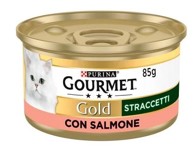 GOURMET GOLD STRACCETTI SALMONE GR 85 Purina Gourmet Straccetti 85G ha creato la ricetta Straccetti: succulenti straccetti cotti lentamente che il tuo gatto adorerà. Componenti analitici: Carni e derivati, Estratti di proteine vegetali, Pesci e sottoprodotti dei pesci (salmone 4%), Sostanze minerali, Sottoprodotti di origine vegetale, Zuccheri. Umidità: 80,0%, Proteina: 13,5%, Grassi grezzi: 2,8%, Ceneri grezze: 2,2%, Fibra grezza: 0,05%. UI/kg: Vit A: 800 Vit D3: 122 mg/kg: Solfato di ferro (II) monoidrato: (Fe: 9,2) Iodato di calcio anidro: (I: 0,22) Solfato di rame (II) pentaidrato: (Cu: 0,80) Solfato manganoso monoidrato: (Mn: 1,7) Solfato di zinco monoidrato: (Zn: 16,3) Taurina: 500.