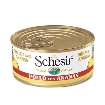 SCHESIR FRUIT CAT G 75 POLLO CON ANANAS Cibo umido di qualità per gatti adulti. Ottenuto dal connubio di pregiati filetti di pollo e polpa di ananas, questo alimento si distingue non solo per lappetibilità, ma anche per il suo apporto nutritivo sano e bilanciato. Ricca di elementi esclusivi, la frutta apporta in modo naturale vitamine e nutrienti che contribuiscono a stimolare il sistema immunitario, contrastare l’invecchiamento cellulare e favorire la digestione. L’ananas grazie ad un enzima presente nella sua polpa (bromelina) ha un’azione antinfiammatoria. Mangime complementare per animali da compagnia. Composizione Filetti di pollo 61%, Ananas 4%, Riso 4%. Componenti analitici Proteina 11%, Grassi grezzi 0,5%, Fibre grezze 0,1%, Ceneri grezze 1,5%, Umidità 84%. Istruzioni per un uso corretto Il mangime è pronto per l’uso e va servito a temperatura ambiente. Lasciare sempre a disposizione dell’animale acqua fresca. La razione giornaliera indicativa per un gatto del peso di 4kg. è di 110 gr. di mangime umido e 35 gr. di mangime secco. Si tratta di valori di riferimento che vanno adattati alle esigenze nutrizionali specifiche dell’animale. Dopo l’apertura conservare in frigorifero e consumare entro 2 giorni.