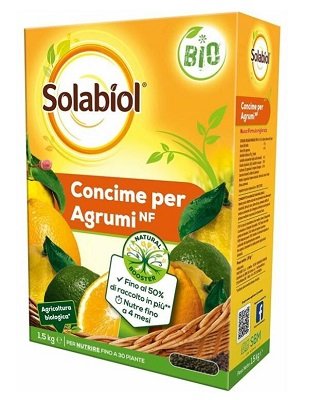 SOLABIOL CONCIME AGRUMI KG 1,5 CONSENTITO IN AGRICOLTURA BIOLOGICA – La miscela ottenuta esclusivamente con materie di prima qualità garantisce un nutrimento bilanciato e duraturo per tutte le piante (orticole, frutticole, floreali ed ornamentali) TECNOLOGIA NATURAL BOOSTER – Tecnologia di origine vegetale che favorisce lo sviluppo dell’apparato radicale. La pianta così esplorerà meglio il suolo e riuscirà ad assorbire tutto il necessario per crescere sana e rigogliosa MAGGIOR ASSORBIMENTO DEGLI ELEMENTI NUTRITIVI – Un apparato radicale più sviluppato è in grado di assorbire più acqua ed elementi nutritivi così da rendere la pianta sana e rigogliosa favorendo raccolti e fioriture FINO AL 50% DI RACCOLTO IN PIU’ – Test effettuati presso i nostri laboratori hanno dimostrato che la combinazione tra Tecnologia Natural Booster e la formulazione appositamente studiata consente di avere fino al 50% di raccolto in più FINO AL 100% DI FIORITURE IN PIU’ – Test effettuati presso i nostri laboratori hanno dimostrato che la combinazione tra Tecnologia Natural Booster e la formulazione appositamente studiata consente di avere fino al 100% di fioriture in più APPLICAZIONE: Mescolare al terriccio o interrare leggermente. Ideale per applicazione al trapianto, rinvaso oppure a ripresa vegetativa NUTRE 4 MESI – La formulazione organica si degrada lentamente nel terreno favorendo così un rilascio graduale degli elementi nutritivi che la pianta lentamente assorbirà CONFEZIONE 100% RICICLABILE – La confezione è costituita da materiale 100% riciclabile. Grazie all’etichettatura ambientale presente sulla confezione sarà più facile individuare il corretto smaltimento della confezione