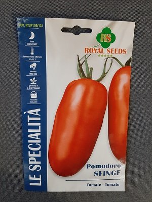 BUSTA ORTO POMODORO SFINGE RS Ibrido indeterminato della tipologia a frutto grande allungato, indicato per coltura in serra campo. I frutti hanno peso medio di 125-145 grammi e di colore verde scuro particolarmente marcato al colletto che vira poi a maturazione al rosso vivo intenso. Il ciclo è medio precoce. Si semina in semenzaio dopo circa 60 giorni alla distanza di 100 cm in pieno campo da Marzo in avanti, ed il trapianto si effettua tra le file e 35 cm sulla fila. Raccomandiamo laute concimazioni organiche e frequenti irrigazioni.