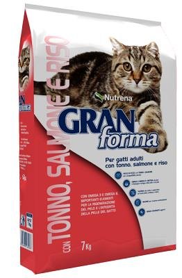 GF CAT TONNO SALMONE RISO KG 7 Alimento completo ideale per lalimentazione quotidiana dei gatti adulti, con tonno, salmone e riso, con Omega 3, Omega 6 e FOS Granforma con Tonno, Salmone e Riso è un alimento ricco in pesci a marchio Nutrena. Completo e bilanciato, è ideale per l’alimentazione quotidiana di gatti adulti di ogni razza. Ricetta leggera ed altamente appetibile, formulata con tonno, salmone e riso, fonti di proteine nobili e naturalmente ricche di antiossidanti ed acidi grassi Omega 3, Omega 6 e biotina, importanti elementi per la rigenerazione del pelo e l’integrità della cute del gatto. Formulato con taurina, amminoacido essenziale indispensabile per il corretto funzionamento del sistema nervoso e muscolare, per la salute dell’apparato cardiocircolatorio ed una vista acuta e nitida. Con selenio in forma organica ad azione antiossidante naturale. Formulazione arricchita con inulina di cicoria, fonte di FOS, prebiotici ideali per il benessere intestinale del gatto. Senza l’aggiunta di coloranti. Composizione Carni e derivati, Cereali (Riso 4%), Pesci e sottoprodotti dei pesci (Tonno 8%, Salmone 8%), Oli e grassi (Grasso di pollo 5%), Sottoprodotti di origine vegetale (Cellulosa 0,5%, Inulina di cicoria – fonte di FOS – 0,1%), Lieviti, Sostanze minerali. Componenti analitici Proteina grezza 33,0%, Grassi grezzi 13,0%, Fibre grezze 2,5%, Ceneri grezze 7,9%, Calcio 1,1%, Fosforo 1,0%, Magnesio 0,09%, Omega 3 0,15%, Omega 6 2,35%. ENERGIA METABOLIZZABILE: 3.735 kcal/kg