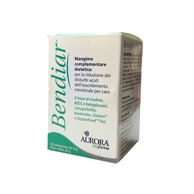 BENDIAR 10 COMPRESSE Il mangime complementare Bendiar Per Cani e Gatti è un mangime dietetico appositamente pensato per i soggetti con disturbi acuti dellassorbimento intestinale di cani e gatti. Molto utile in casi di diarrea acuta e nella convalescenza successiva di pelosetti di media e grossa taglia. Bendiar Per Cani e Gatti contiene inulina, che aumenta la concentrazione di lattobacilli e bifidobatteri presenti nellintestino, migliorando il transito intestinale. sciroppo di glucosio in polvere (28.28%), idrolizzato di fegato (da avicoli), mannano-oligosaccaridi (MOS) e betaglucani (5%), inulina (5%), magnesio stearato, cloruro di sodio, fosfato dicalcico, farina di macroalghe (Chlorophyta, Phaeophyta e Rhodophyta) (OceanFeed Pet) (1.5%), lignocellulosa idrolizzata (Oxilem®) (1.5%), cloruro di potassio. Proteina grezza: 4.95%, Fibra grezza 16.25%, Grassi grezzi 0.56%, Ceneri grezze 24.70%, Umidità 5.6%, Sodio 1.80%, Potassio 0.60%. E460 Cellulosa microcristallina 178000 mg. Antiagglomeranti: 1g598 Clinoptilolite di origine sedimentaria 100000 mg, 1m558i Bentonite 100000 mg, E551a Acido silicico precipitato ed essiccato 10000 mg.