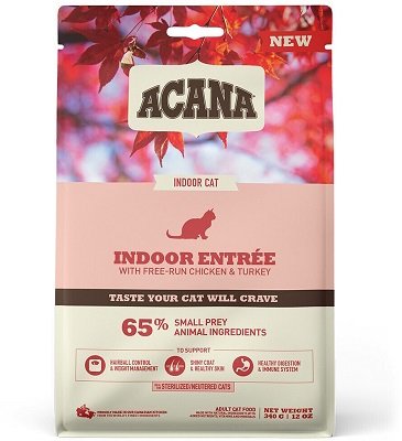 ACANA CAT INDOOR ENTREE GR 340 La carne è sempre primo ingrediente. ACANA Indoor Entrée è ricco di pollo, tacchino e tenero, delizioso coniglio, tutti nelle proporzioni della preda intera, con carne, interiora e cartilagine: la ricetta ideale per nutrire ogni gatto in modo completo. ACANA Indoor Entrée garantisce al tuo gatto sterilizzato/che vive in casa tutti i nutrienti di cui ha bisogno in modo naturale, oltre ad un gusto irresistibile che certamente adorerà. Ricco di proteine animali e fibre di origine naturale per aiutare a ridurre la formazione di boli di pelo Controllo del peso L’apporto bilanciato di calorie derivanti da proteine e grassi aiuta a mantenere sotto controllo il peso Pelle e pelo sani Un apporto bilanciato di acidi grassi Omega-3 e Omega-6 per supportare pelle e pelo sani Gusto irresistibile Ingredienti animali da prede di piccole dimensioni e infusioni di fegato garantiscono un gusto irresistibile, che i gatti adoreranno Ingredienti Carne di pollo fresca (16%), carne di pollo disidratata (16%), aringa disidratata (16%), avena intera, piselli interi, grasso di pollo (5%), miscanto tritato, lenticchie verdi intere, carne di tacchino fresca (4%), aringa intera cruda (4%), ceci interi, lenticchie rosse intere, fibra di lenticchia, coniglio intero crudo (1%), interiora di pollo fresche (fegato, cuore) (1%), interiora di tacchino fresche (fegato, cuore) (1%), cartilagine di pollo (1%), alga Kelp disidratata, zucca Popone intera fresca, zucca intera fresca, mirtilli rossi interi freschi, mirtilli interi freschi. ADDITIVI (per kg): Additivi tecnologici: antiossidanti naturali. Additivi nutrizionali: cloruro di colina: 1.200 mg, taurina: 400 mg, zinco (chelato di zinco di amminoacidi idrato): 150 mg, vitamina B1: 25 mg, vitamina B2: 10 mg, niacina: 50 mg, vitamina B5: 8 mg, vitamina B6: 7,5 mg, acido folico: 0,75 mg, biotina: 0,03 mg, vitamina B12: 0,1 mg, vitamina A: 1.875 IU, vitamina D: 250 IU, vitamina E: 175 IU, rame (chelato di rame (II) di amminoacidi idrato): 11 mg, L-carnitina: 50 mg, DL-metionina: 99 mg. Additivi zootecnici: Enterococcus faecium NCIMB10415: 600x10^6 CFU. L’ENERGIA METABOLIZZABILE è di 3.630 kcal/kg (414 kcal per dosatore 250 ml/114 g). Le calorie provengono per il 38% da proteine, il 22% da carboidrati e il 40% da grassi, per supportare il benessere generale. ACANA Cat Indoor Entrée è formulato in linea con i livelli nutrizionali stabiliti da FEDIAF per l’alimentazione di mantenimento per gatti adulti. Componenti analitici Proteina grezza 37% Grassi grezzi 14% Fibre grezze 6% Ceneri grezze 9% Umidità 10% Calcio 1,4% Fosforo 1% Magnesio 0,1% Taurina 0,1% Acidi grassi Omega-6 2% Acidi grassi Omega-3 0,5% DHA 0,2% EPA 0,1%