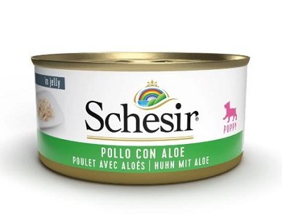 SCHESIR DOG PUPPY POLLO CON ALOE GR 150 Schesir Puppy Filetti di pollo con aloe 150g cibo umido in gelatina con ingredienti naturali al 100%, privi di conservanti e coloranti solo le parti migliori del pollo, cotte al vapore e lavorate a mano. Specificatamente pensato per i cuccioli, con aloe. Filetti di pollo 49%, Aloe 5%, Riso 2%, Olio di girasole 1,7%. Vit. A 2000 U.I., vit. E 10 mg, solfato di zinco eptaidrato, 143 mg, solfato ferroso, monoidrato 28 mg, solfato, manganoso monoidrato, 7 mg, ioduro di potassio, 14 mg, solfato rameico, pentaidrato 4 mg. Proteina 9,5%, Grassi grezzi 2%, Fibre grezze 0,1%, Ceneri grezze 1%, Umidità 85%, 59 kcal/100 g.