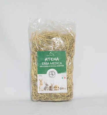 ERBA MEDICA ATENA GR 500 L’Erba Medica è “il cavallo di battaglia”, è una leguminosa molto nutriente con altissimo apporto proteico. E’ l’elemento essenziale per la corretta alimentazione del tuo coniglietto e/o del tuo piccolo roditore poiché le erbe fresche e/o essiccate sono tra i primi alimenti della piramide alimentare. Le erbe contengono preziosi sali minerali, calcio, vitamine e fibra per la motilità intestinale. L’erba medica è indispensabile per femmine in dolce attesa e per i cuccioli nei primi mesi di vita e chi si nutre di erbe miste e fieno non avrà problemi di obesità. La nostra erba medica offre al vostro animaletto domestico genuinità e benessere poiché non è trattata con antiparassitari, pesticidi, fertilizzanti o altre sostanze chimiche, questo fa si che possa gustarla come fosse appena raccolta. Conservare in luogo fresco, asciutto e lontano dai raggi solari e dalle fonti di calore. Ingredienti fieno di erba medica essiccazione naturale tipo di mangime semplice umidità 9,6%* proteina grezza 14,5% s.s.* cellulosa grezza 19,6%* *dati relativi ad analisi svolte da laboratorio accreditato