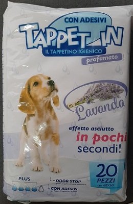 TAPPETINI TAPPET IN LAVANDA 60X60 PZ 20 TAPPET-IN Tappet In è un tappettino multistrato di alta qualità profumato alla lavanda, ultra-assorbente e anti-odore, in grado di risolvere il problema igienico causato dai cuccioli addestrati in casa. Il primo strato, realizzato a griglia, permette la diffusione omogenea del liquido, è filtrante e garantisce un effetto asciutto immediato. Il secondo strato, grazie alla realizzazione in cellullosa e in speciali polimeri super-assorbenti, assicura un’efficace azione assorbente e allo stesso tempo antibatterica, riducendo la proliferazione di batteri e l’insorgenza di cattivi odori. In questo strato i liquidi vengono assorbiti e trattenuti definitivamente. Infine lultimo strato, impermeabile, mantiene la superficie sottostante perfettamente asciutta. Gli speciali strip adesivi consentono di mantenere il tappeto sempre in posizione, mentre i 4 cm di bordo evitano fuoriuscite e facilitano la dismissione del prodotto. Ideale in casa come in viaggio, Tappet In può essere utilizzato anche come fondo per cucce e trasportini. Tappet in è un prodotto di qualità superiore, realizzato con assorbente contenente uno speciale polimero 3G SAP proveniente dal Giappone. La capacità di assorbimento di tappet-in è fino a tre volte superiore ad altri prodotti analoghi.