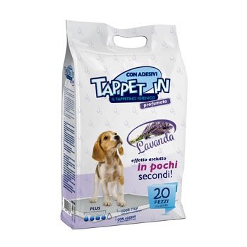 TAPPET IN PROFUMATO LAVANDA CM. 60X90 BOX 20 PZ. TAPPET-IN Tappet In è un tappettino multistrato di alta qualità profumato alla lavanda, ultra-assorbente e anti-odore, in grado di risolvere il problema igienico causato dai cuccioli addestrati in casa. Il primo strato, realizzato a griglia, permette la diffusione omogenea del liquido, è filtrante e garantisce un effetto asciutto immediato. Il secondo strato, grazie alla realizzazione in cellullosa e in speciali polimeri super-assorbenti, assicura un’efficace azione assorbente e allo stesso tempo antibatterica, riducendo la proliferazione di batteri e l’insorgenza di cattivi odori. In questo strato i liquidi vengono assorbiti e trattenuti definitivamente. Infine lultimo strato, impermeabile, mantiene la superficie sottostante perfettamente asciutta. Gli speciali strip adesivi consentono di mantenere il tappeto sempre in posizione, mentre i 4 cm di bordo evitano fuoriuscite e facilitano la dismissione del prodotto. Ideale in casa come in viaggio, Tappet In può essere utilizzato anche come fondo per cucce e trasportini. Tappet in è un prodotto di qualità superiore, realizzato con assorbente contenente uno speciale polimero 3G SAP proveniente dal Giappone. La capacità di assorbimento di tappet-in è fino a tre volte superiore ad altri prodotti analoghi.