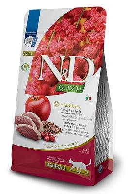 N&D QUINOA CAT HAIRBALL KG 1,5 HAIRBALL - Ricetta anatra, quinoa, mela e mirtillo rosso. Alimento completo per gatti adulti. N&D Quinoa Hairball è un alimento completo per gatti, indicato per favorire l’espulsione dei boli di pelo. COMPOSIZIONE anatra disossata (20%), proteine di anatra disidratate (20%), amido di pisello, fibra di piselli, semi di quinoa estratti (8%), grasso di pollo, proteina di pesce idrolizzata, uova essiccate, semi di lino, polpa di barbabietola essiccata, olio di pesce (da aringa), mela essiccata (2.5%), mirtillo rosso essiccato (2.5%), bucce e semi di psillio, spinaci essiccati, farina di erba medica, fruttoligosaccaridi (0.6%), estratto di lievito (fonte di manno-oligo-saccaridi) (0.6%), solfato di calcio diidrato (0.4%), lievito di birra essiccato, cloruro di potassio, cloruro di sodio, estratto di Aloe vera, glucosamina, solfato di condroitina. ADDITIVI PER KG Additivi nutrizionali: Vitamina A 18000UI Vitamina D3 1200UI Vitamina E 600mg Vitamina C 300mg Niacina 150mg Calcio D-pantotenato 50mg Vitamina B2 20mg Vitamina B6 8.1mg Vitamina B1 10mg Biotina 1.5mg Acido folico 1.5mg Vitamina B12 0.1mg Cloruro di colina 2200mg Beta-carotene 5mg Zinco (chelato di zinco dellanalogo idrossilato della metionina): 163.80mg Manganese (chelato di manganese dellanalogo idrossilato della metionina): 64.60mg Ferro [chelato di ferro (II) di idrato di glicina]: 58.30mg Rame (chelato di rame dellanalogo idrossilato della metionina): 15.80mg DL-metionina, tecnicamente pura 4500mg L-cistina 3000mg Monocloridrato di L-lisina, tecnicamente puro 2500mg Taurina 2400mg. Additivi tecnologici: cellulosa microcristallina. Additivi sensoriali: estratto di tè verde 100mg estratto di rosmarino. Antiossidanti: estratti di tocoferolo da oli vegetali. COMPONENTI ANALITICI proteina grezza 34.00% grassi grezzi 15.00% fibre grezze 8.00% umidità 8.00% ceneri grezze 7.60% Calcio 1.00% Fosforo 0.80% Sodio 0.30% Potassio 0.60% Magnesio 0.08% Omega-6 2.00% Omega-3 0.50% DHA 0.15% EPA 0.10% Glucosamina 1200mg/kg Solfato di condroitina 900mg/kg. Additivo acidificante dellurina: solfato di calcio diidrato 4000mg/kg. VALORE ENERGETICO EM Kcal/Kg 3663 - Mj/Kg 15,32