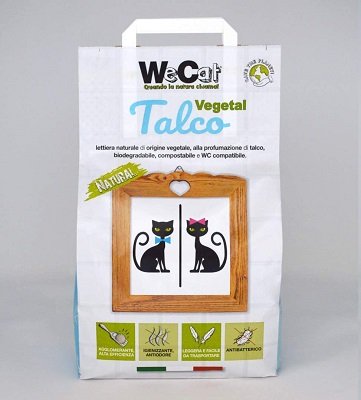 WECAT PROFUMATA TALCO KG 3,5 LT 6 WECAT è una lettiera studiata per le principali esigenze dei gatti, innovativa e realizzata con un mix di ingredienti completamente naturali di origine vegetale. Prodotta a ridotto impatto ambientale, salvaguarda e rispetta il gatto e lambiente che ci circonda. WeCat inibisce la formazione dei cattivi odori, è facile da smaltire nel wc e nel rifiuto organico urbano. Questa sabbia è unica, ed è migliore rispetto alle altre naturali perchè è EXTRA ASSORBENTE, e possiede PROPRIETA AGGLOMERANTI MAI VISTE PRIMA. Molto SOFFICE AL TATTO dei polpastrelli felini e composta da GRANELLI MORBIDI, molto LEGGERA e facile da trasportare e con una LUNGA DURATA. Infatti non bisognerà sostituirla per intero, ma, essendo agglomerante, basterà rimuovere la pallina creata dalle urine del gatto e reintegrarla con del prodotto pulito. WeCat viene prodotta completamente in Italia, utilizza una formula innovativa, studiata e progettata dalla passione e dalla competenza di un team di esperti. Una lettiera che nasce da materie prime delle nostre terre. 100% VEGETALE La pallina agglomerata può essere gettata nello scarico: è smaltibile nel WC senza rischio dintasamento Un prodotto naturalmente igienizzante. Neutralizza i cattivi odori e inibisce la profilazione di batteri. In più è agglomerante, non si attacca al fondo della vaschetta ed è facile da pulire. Smaltibile come rifiuto organico, oppure nel compost. WeCat è la scelta responsabile che migliora le nostre abitudini e non appesantisce le spese di smaltimento nellindifferenziato! Rispetta ciò che ci circonda. Ecosostenibile, non comporta danni per lambiente, nè con la sua produzione nè con lo smaltimento.