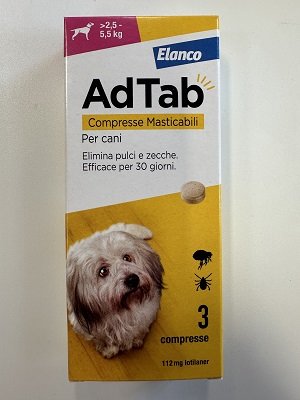 ADTAB COMPRESSE CANE >2.5-5.5 KG ELANCO Compresse masticabili antiparassitari per Cani da 2,50 a 5,50 kg Elimina pulci e zecche per un mese con unazione immediata. Di facile somministrazione in quanto è una compressa masticabile al gusto di carne. Può essere utilizzato nei cani da 8 settimane. Contiene Lotilaner come ingrediente attivo. Contenuto: 1 compressa Eliminazione delle pulci (Ctenocephalides felis e C. canis) Eliminazione delle zecche (Rhipicephalus sanguineus, Ixodes ricinus, I. hexagonus e Dermacentor reticulatus). Pulci: Altamente efficace > 99% efficace Uccide le pulci preesistenti in 6 ore (99,2%) Uccide le nuove pulci acquisite durante il mese in 4 ore Zecche: elimina le zecche preesistenti in 8 ore (99,2%) Uccide le zecche acquisite durante il mese in 48 ore.