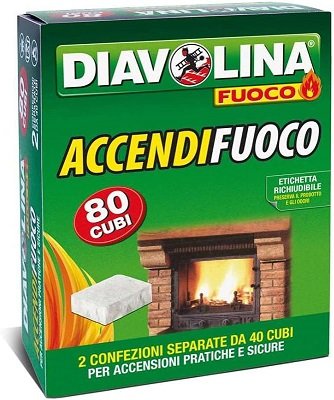 ACCENDIFUOCO PZ 80 DIAVOLINA Il classico cubetto bianco di Diavolina è l’accendifuoco per eccellenza, il più venduto in Italia. A base di kerosene, è ideale per l’accensione immediata di stufe, caminetti e barbecue. È la soluzione più facile ed efficace per accendere il fuoco.