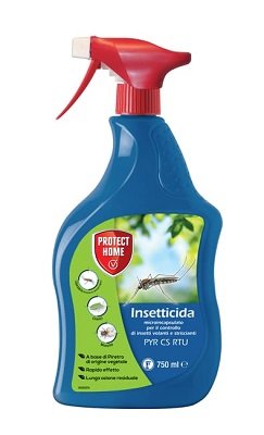 INSETTICIDA ZANZARA RTU 750 ML PROTECT HOME Insetticida liquido pronto all’uso per il controllo di insetti volanti e striscianti come: Zanzara, Mosche, Scarafaggi, Formiche, Cimici, ecc a base di piretro naturale. Il prodotto è registrato per uso su aree esterne come cespugli, tappeti erbosi, giardini e parchi cittadini e aree interne come edifici civili e industriali, aree e ambienti rurali e industrie alimentari. La speciale formulazione di microincapsulazione protegge il principio attivo con un rivestimento che garantisce: • Rapido effetto effetto abbattente • Fino a 1 mese di protezione • Attività repellente AMPIA GAMMA DI UTILIZZI: è idoneo alla disinfestazione di: edifici civili ed industriali pubblici e privati industria alimentare ed aree di lavorazione degli alimenti: cucine (ristoranti e rivendite), locali di vendita al dettaglio aree ed ambienti rurali mezzi di trasporto: autobus, navi, camion, treni ed aerei. UTILIZZO: trattamenti diretti contro mosche, zanzare (inclusa la zanzara tigre), vespe, scarafaggi, formiche, pesciolini d’argento, ragni e cimici. Oppure trattamenti spot sulle superficie nei punti di passaggio degli insetti o dove si annidano.