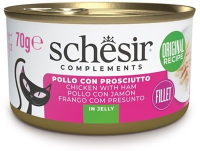 CAT POLLO PROSCIUTTO JELLY 70 GR SCHESIR Filetti di Pollo con Prosciutto (alimento complementare): filetti di pollo 51%, prosciutto 4%, riso 1,5%