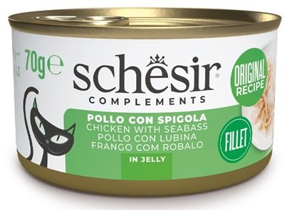 CAT POLLO SPIGOLA JELLY 70 GR SCHESIR Composizione: pollo 51%, spigola* 4%, riso 1,5%. Componenti analitici: proteina 12%, grassi grezzi 1%, fibre grezze 1%, ceneri grezze 2%. Umidità 86%.