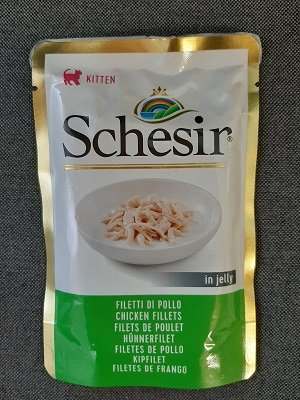 SCHESIR CAT KITTEN POLLO BUSTA GR 85 La ricetta Schesir è a base di veri filetti di pollo, con una piccola aggiunta di olio di girasole, che apporta acidi grassi omega. La preparazione è in gelatina, per una consistenza sfiziosa e più compatta nella ciotola. La ricetta è specifica per i cuccioli di gatto L’ingrediente principale della ricetta è il pollo L’olio di semi fornisce acidi grassi omega Con ingredienti naturali Il pollo è cotto al vapore e lavorato a mano Tutti i prodotti Schesir sono senza conservanti e coloranti aggiunti Cruelty free Pratico formato busta “apri, premi e servi nella ciotola” POLLO* 62%, RISO* 1,5%, OLIO DI SEMI DI GIRASOLE* 1%, GRASSO DI POLLO* 0,5%, SALI MINERALI *Ingredienti naturali COMPONENTI ANALITICI Proteine 11% Grassi grezzi 2% Fibre grezze 0,1% Ceneri grezze 1% Calcio 200 mg/100g Fosforo 200 mg/100g Umidità 82% ADDITIVI Taurina 400 mg Zn (solfato di zinco eptaidrato) 113,5 mg Fe (solfato di ferro (II) monoidrato) 13,13 mg Cu (solfato di rame(II) pentaidrato) 1,5 mg Mn (solfato manganoso monoidrato) 1,30 mg I (ioduro di potassio) 0,31 mg Vitamina D3 100 U.I.