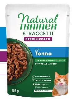 CAT STERILIZED STRACCETTI TONNO 85 G NATURAL TRAINER COMPOSIZIONE Carni e derivati, pesci e sottoprodotti dei pesci (4% tonno), sottoprodotti di origine vegetale (0,4% polpa di barbabietola), sostanze minerali, zuccheri. ADDITIVI PER KG Additivi nutrizionali: Vitamina E 100 UI, taurina 100 mg, L-carnitina 95 mg, biotina 100 μg, solfato manganoso monoidrato 9,2 mg (manganese: 3 mg), solfato di zinco monoidrato 55 mg (zinco: 20 mg). COMPONENTI ANALITICI Proteina grezza 8,5%, grassi grezzi 4%, fibra grezza 1,1%, ceneri grezze 1,8%, umidità 82%. Energia metabolizzabile: 770 kcal/kg.