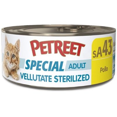 SA43 NATURA VELLUTATE STERILIZED POLLO G70 PETREET Composizione Petto di pollo 38%, olio di soia, proteine idrolizzate di pesce e pollo, farina di riso, cellulosa in polvere, sostanze minerali, estratto di pesce.
