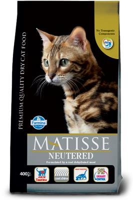 MATISSE NEUTERED 1,5 KG Alimento completo ed equilibrato per gatti in età adulta, indicato per gatti sterilizzati. COMPOSIZIONE Carne di pollo disidratata (32%), riso (25%), mais, glutine di mais, fibra di pisello (8%), pesce disidratato, grasso di pollo, polpa di barbabietola essiccata (6%), proteine animali idrolizzate, olio di pesce, olio vegetale, uova intere disidratate, semi di psyllium, cloruro di sodio, cloruro di potassio, solfato di calcio biidrato, lievito di birra essiccato, fosfato monosodico. ADDITIVI PER KG Additivi nutrizionali: Vitamina A 16000UI Vitamina D3 1600UI Vitamina E 160mg Vitamina C 160mg Niacina 40mg acido pantotenico 16mg Vitamina B2 8mg Vitamina B6 6.4mg Vitamina B1 4.8mg Vitamina H 0.4mg acido folico 0.48mg Vitamina B12 0.06mg cloruro di colina 2500mg ossido di zinco 108mg solfato di zinco monoidrato 120mg solfato manganoso monoidrato 150mg solfato ferroso monoidrato 44mg carbonato ferroso 60mg solfato rameico pentaidrato 50mg iodato di calcio anidro 2.4mg selenito di sodio 0.22mg DL-metionina 3000mg L-carnitina 250mg. Additivi tecnologici: cellulosa micro-cristallina. COMPONENTI ANALITICI Proteina grezza 31.00% oli e grassi grezzi 11.00% fibra grezza 5.90% ceneri grezze 6.60% Calcio 0.90% Fosforo 0.85% Magnesio 0.08% amido 19.50% zuccheri totali 0.60% Taurina 1800mg/kg.